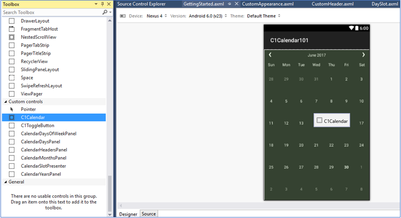 Alternatively, you can drag a C1Calendar control from the Toolbox within the custom control tab onto your layout surface in designer mode.