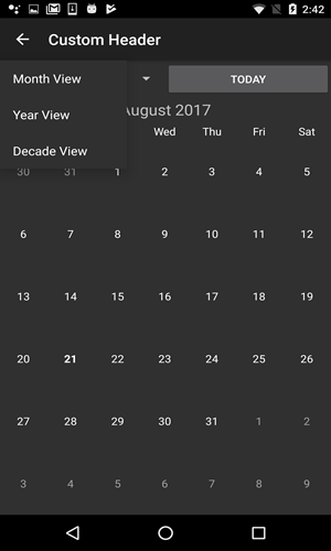 On tapping the Month label, the calendar provides option to switch to month or year mode. The Today label navigates the calendar to the current day.