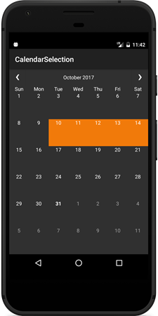 The C1Calendar control allows users to select a day on the calendar by tapping a date. However, you can set the number of days that you wish to select by using the MaxSelectionCount property in code. For instance, on setting the MaxSelectionCount property to 5, you can select a maximum of 5 days on the calendar as illustrated in the image below.
