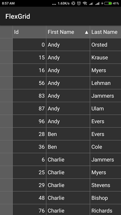 The image below shows how the FlexGrid appears after sorting is applied to the grid by tapping header of the column, FirstName.