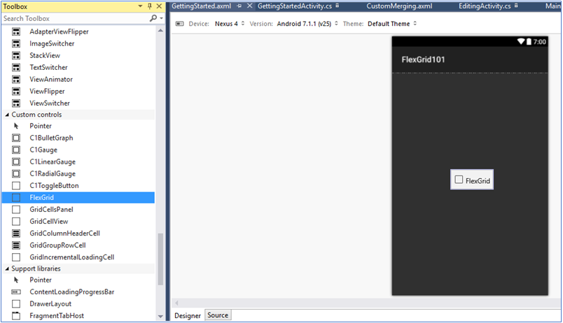 Alternatively, you can drag a FlexGrid control from the Toolbox within the custom control tab onto your layout surface in designer mode.