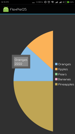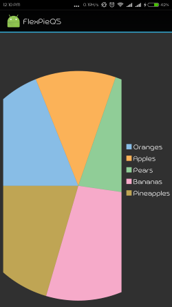 Similarly, panning can be implemented in FlexPie chart by creating an object TranslateBehavior class available in the C1.Android.Chart.Interaction namespace and passing it as a parameter to the Add method. This method adds translation behavior to the behavior collection by accessing it through Behaviors property of the ChartBase class. In addition, you can use the TranslationX and TranslationY property of FlexPie class to set the translation x and translation y delta for the chart.