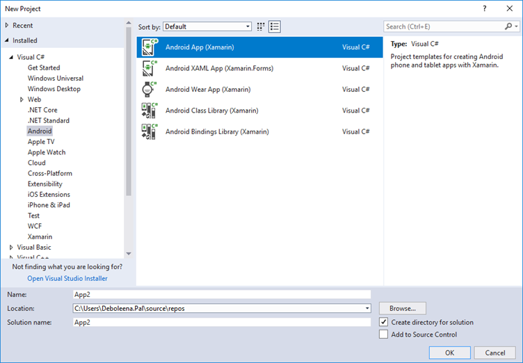 - Under Installed templates, select Visual C# | Android.