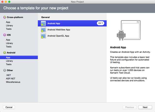 - In the right pane, select Android App (Xamarin).