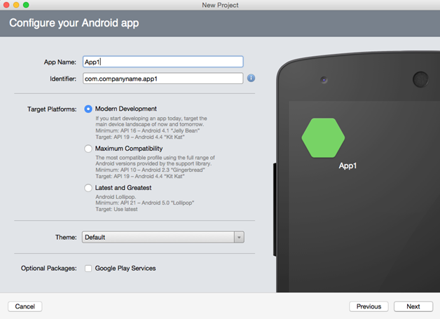 - Click OK. The New Android App dialog appears.