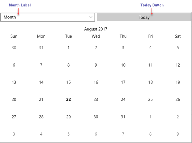 The Calendar control shows a default header that displays the current month or year and navigation buttons. However, users can hide or remove the default header by setting the ShowHeader to false in XAML, and apply a custom header.