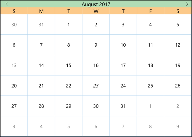 FontFamily="Segoe UI" FontSize="16" BorderColor="Black" BorderWidth="4" DayOfWeekBackgroundColor="#FCC989"