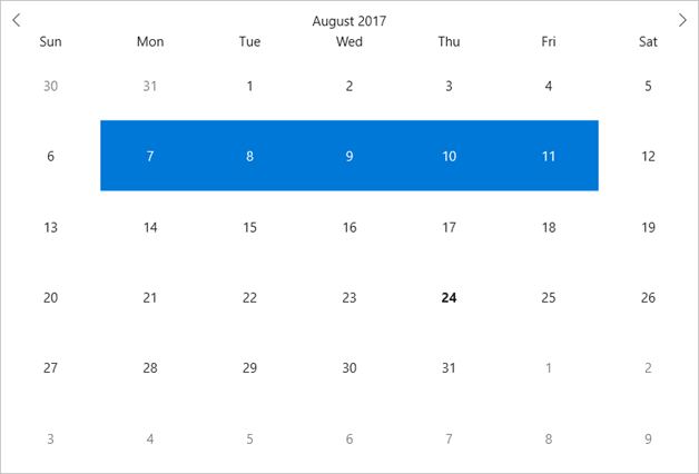The Calendar control allows users to select a day on the calendar by tapping a date. However, you can set the number of days that you wish to select by using the MaxSelectionCount property in code. For instance, on setting the MaxSelectionCount property to 5, you can select a maximum of 5 days on the calendar as illustrated in the image below.
