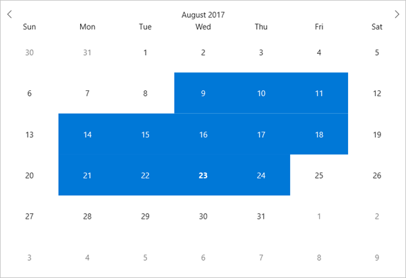 You can customize the default behavior of the calendar control to select specific dates. For instance, consider a scenario where you wish to select only weekdays on tapping two dates in different workweeks. For this, you simply need to subscribe the OnSelectionChanging event and apply selection condition in the handler.