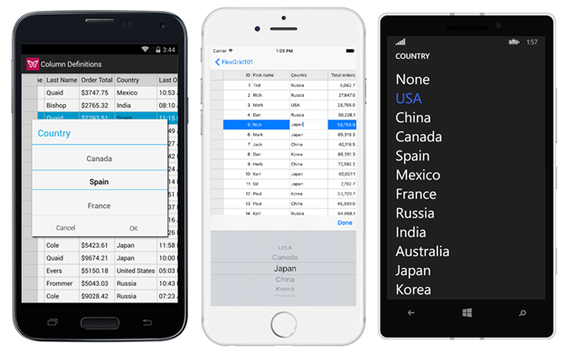 Data Mapping provides auto look-up capabilities in FlexGrid. For example, you may want to display a customer name instead of his ID, or a color name instead of its RGB value. When data mapping is configured for a column, a picker is displayed when the user edits the cell.