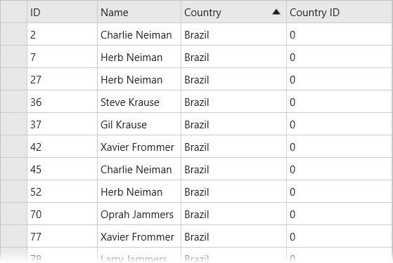 The image below shows how the FlexGrid appears after sorting is applied to the grid by tapping header of the column, Country.
