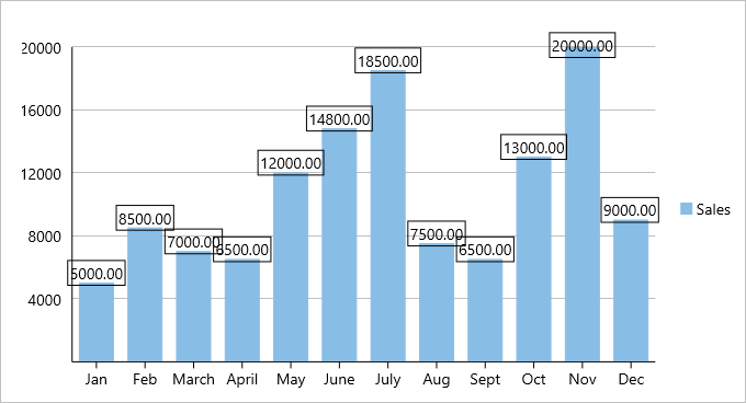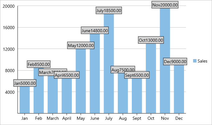 The following code example demonstrates how to use data labels in FlexChart and set their position. This examples uses the sample created in the Quick Start section.