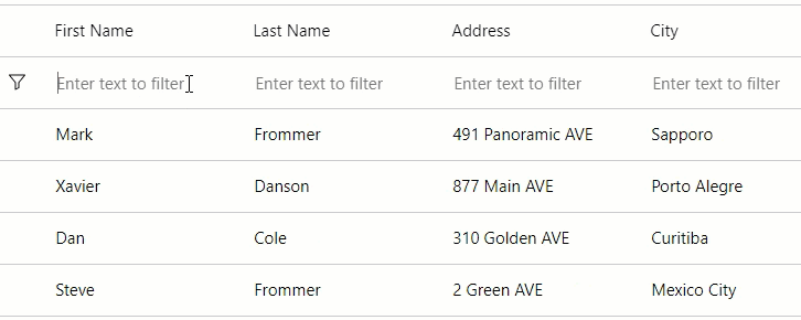 A filter row is a fixed row which consists of cells as text boxes that allows you to enter text within the row to filter the corresponding columns. When you type text in the filter row, a filter condition is created based on the entered text and the data is filtered accordingly. FlexGrid supports filter row that filters data against the values stored within the underlying dataset by creating appropriate filter criteria in the cells. This is easily implemented in FlexGrid using the GridFilterRow class. This class represents a row whose cells are text boxes which can be used to filter data in the corresponding column.