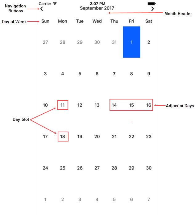 The C1Calendar control comprises of various functional parts such as Header, Day of Week, Day Slot, etc. These functional parts are illustrated below.