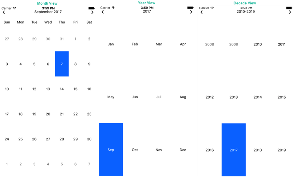 The C1Calendar for iOS supports month, year and decade views as shown in the image below. The calendar switches from month to year view when the user taps the month header. On tapping the year header, the calendar switches to decade view. The calendar switches back to the month view on tapping the header on the decade view, completing a full circle from Month<Year<Decade<Month view.