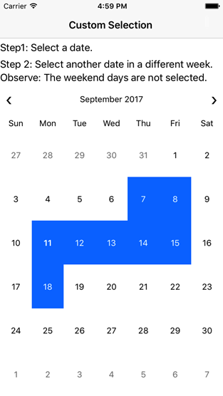 The following image shows a C1Calendar that only selects weekdays and deselect weekends on tapping two different dates in different workweeks.