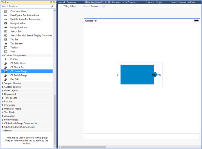 In the Toolbox under Custom Components tab, drag a C1LinearGuage, C1RadialGauge, or C1BulletGraph onto the View Controller.