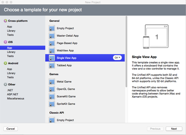 - In the right pane, select Single View App.