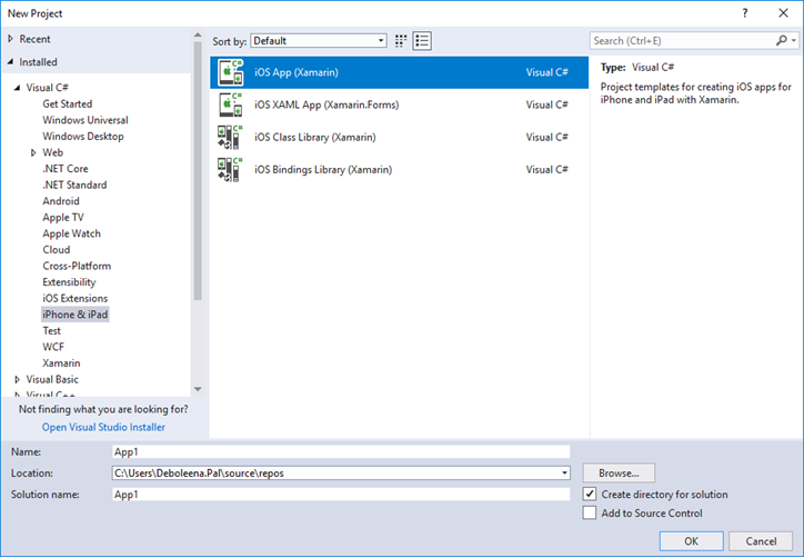 - Under Installed templates, select Visual C# |iPhone & iPad.