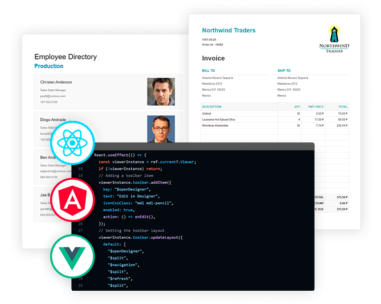 - Use with the report viewer component with support integrations for React, Angular, and Vue