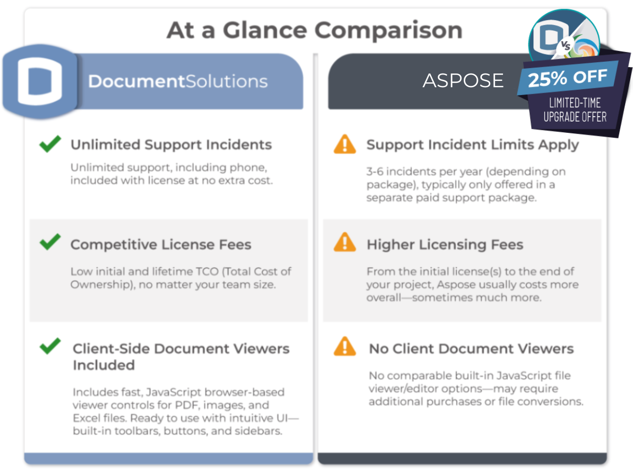 Support Comparisons: Aspose has set incident limits that require additional purchases for extended support, while Document Solutions includes unlimited support incidents with all licenses.