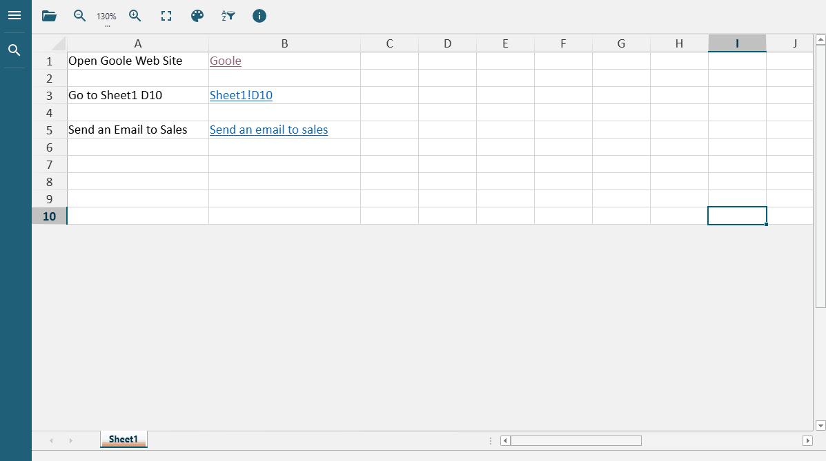 DsDataViewer supports displaying and interacting with hyperlinks within cells. Upon clicking a hyperlink, users can navigate to a specific location within the current worksheet, open external web pages, or access email addresses, among other destinations.
