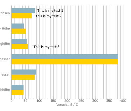 Now I would like every bar to show a custom text label next to it — not the default data point marker that displays the numeric value, but an arbitrary string (e.g., “This is my test 1”, “This is my test 2”, etc., see image 2).