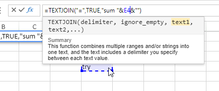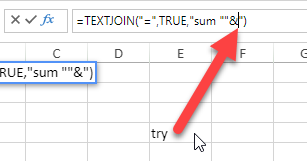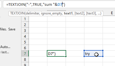 Hi, when I’m trying to add cell reference in a formula as part of a string like: =TEXTJOIN(“=”,TRUE,"sum ") next to the word “sum”, I have to write “&&” and put the cursor between the ampersand so I’ll be able to select cell reference.