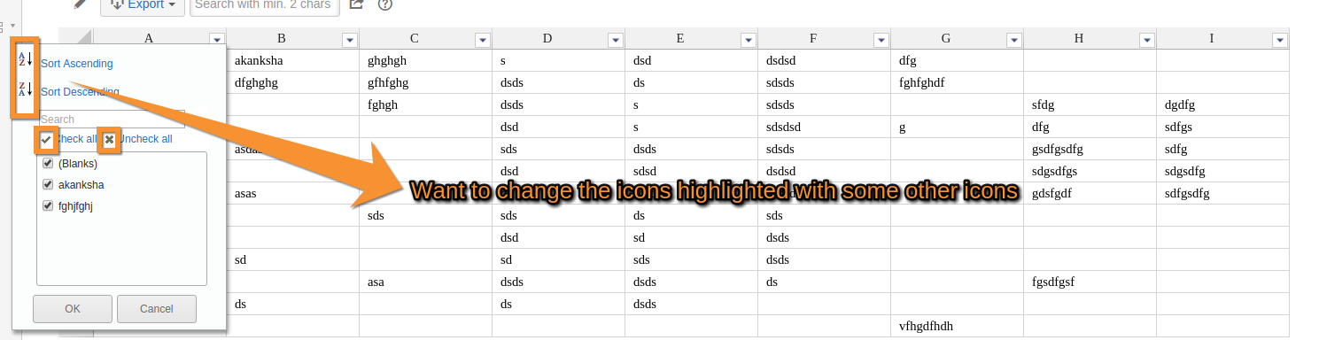 Is it possible to change the sort ascending icon, sort descending icon, check all and uncheck all icon used in the row filter dialog of spreadjs.