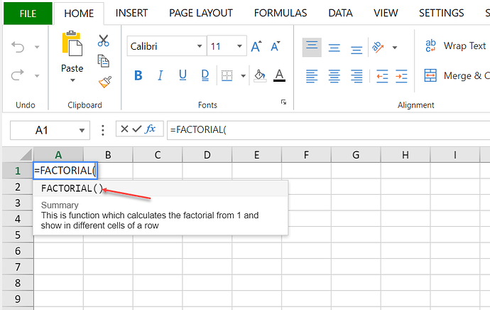 description: 'This is function which calculates the factorial from 1 and show in different cells of a row'