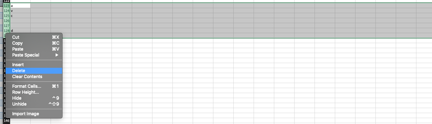 SpreadJS supports the excel-like deletion of multiple rows/columns by first selecting the multiple rows/columns by click and dragging the mouse over the row/column headers and then choosing the delete option from the context menu.