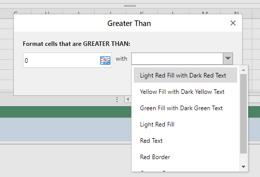 - Styles → Conditional Formatting → Highlight Cell Rules → Greater Than → The format option can not be selected