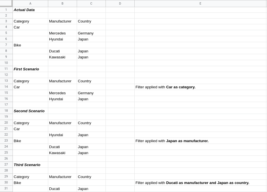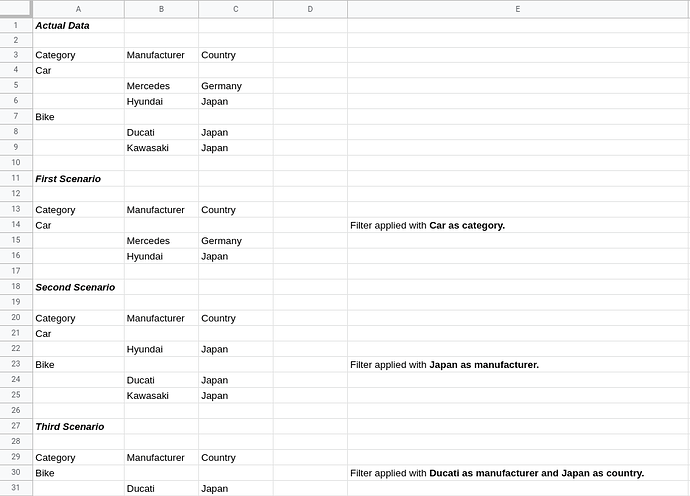 First scenario: If filter is to be applied on a group with Car as category, then the filtered sheet output should be