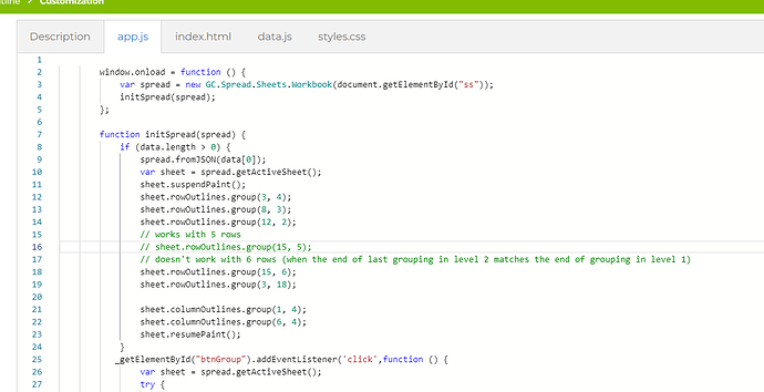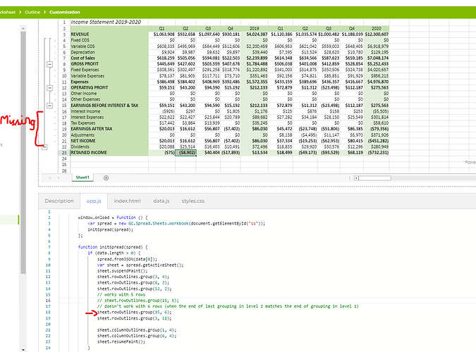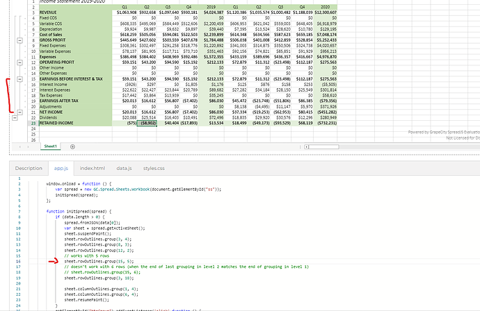I’m using rowOutlines to group rows in a sheet. These groups are expected to be nested. However, I’m facing a bug while doing this.