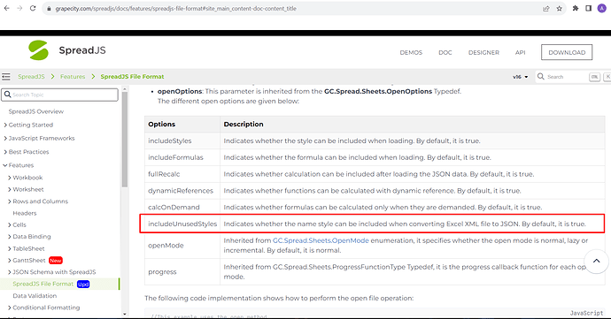 As indicated in the following documentation (https://www.grapecity.com/spreadjs/docs/features/spreadjs-file-format#site_main_content-doc-content_title), the “includeUnusedStyles” feature determines whether named styles should be included when converting an Excel XML file to JSON. By default, this feature is set to true.