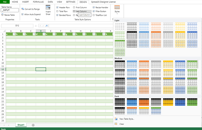 Please check screenshot below. I changed table style to some green theme but after saving and loading json later, the choosen styling is gone and back to the default grey.