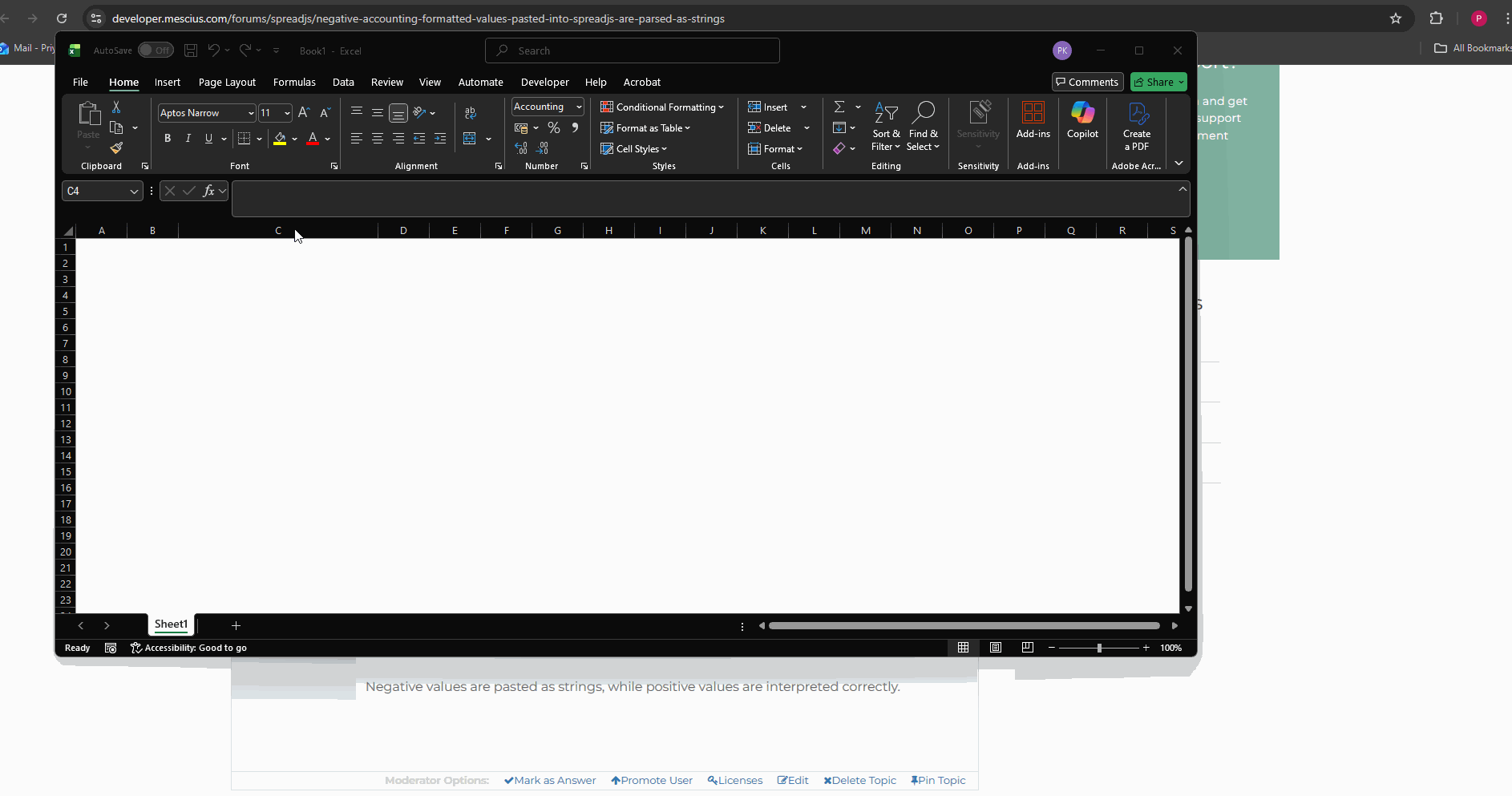 When pasting values formatted as Accounting from Excel or Google Sheets into SpreadJS, the pasted cells are treated as strings instead of numeric values. This issue does not occur when pasting the same values between Excel and Google Sheets, where they remain numeric, nor when pasting currency-formatted values into SpreadJS.