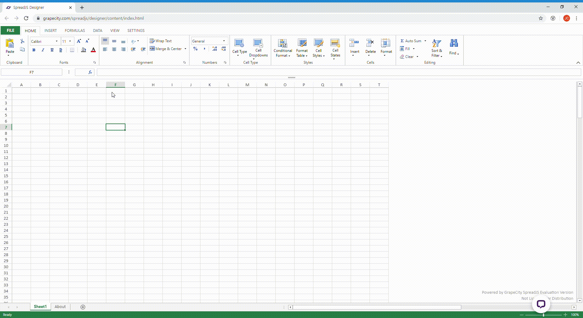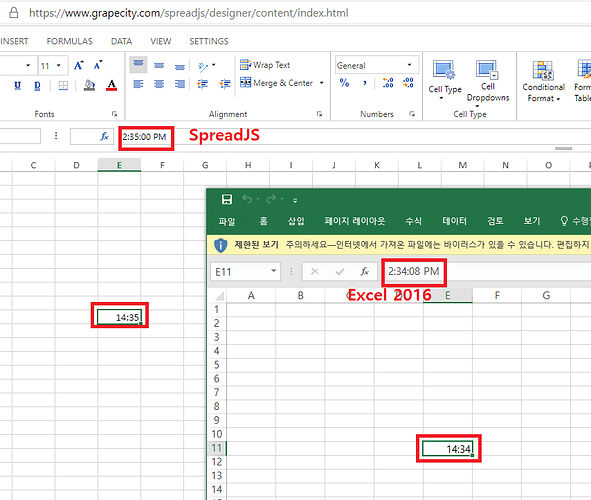 - Enter hh:mm formatted text in a cell, such as “14:35”, in a spreadJS sheet.