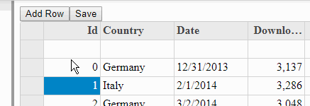 That’s working fine. However, the new row doesn’t seem to register with the grid’s selection mechanism. The new row takes two clicks to select (actually, it looks like perhaps an empty cell behind the new row is selected on the first click). Similarly, pressing the ‘up’ key from the second row does not bring the selection the new first row; the selection seems to be lost somewhere. This can be observed in the example code provided at the post above. Look at http://plnkr.co/edit/4tVvwx?p=preview