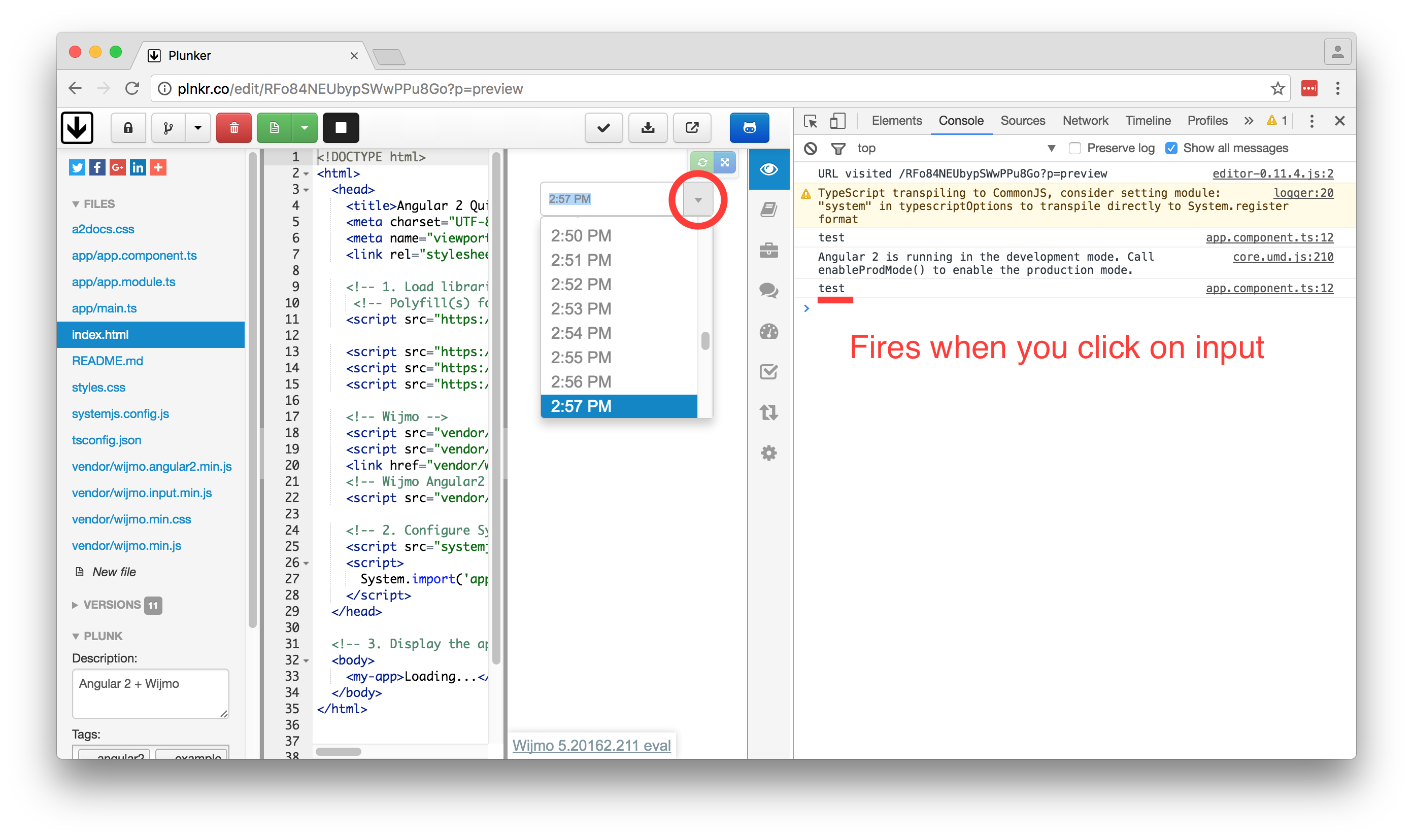 import { Component } from '@angular/core'; @Component({ selector: 'my-app', template: '<wj-input-time [(value)]="testDate" [step]="1" (valueChanged)="test()"></wj-input-time>' }) export class AppComponent { testDate: Date = new Date(); test() { console.log('test'); } }