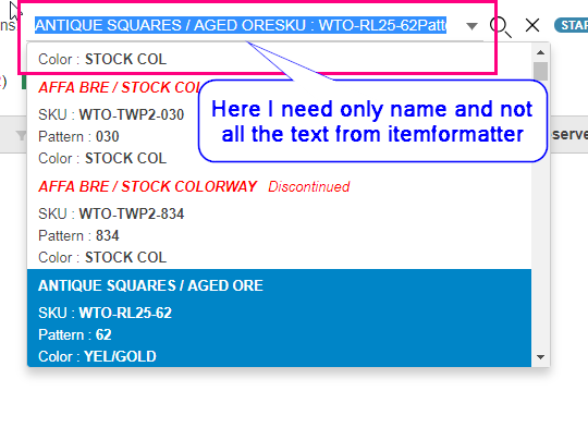I need to know after search and selection the text comes from itemformatter. But I need only the name in selection.