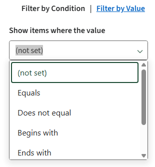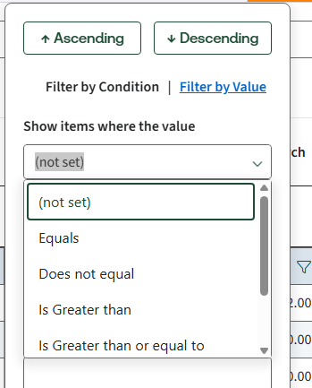 Because of this reason the number column has different Filter by condition types than a usual Number non-dropdown column