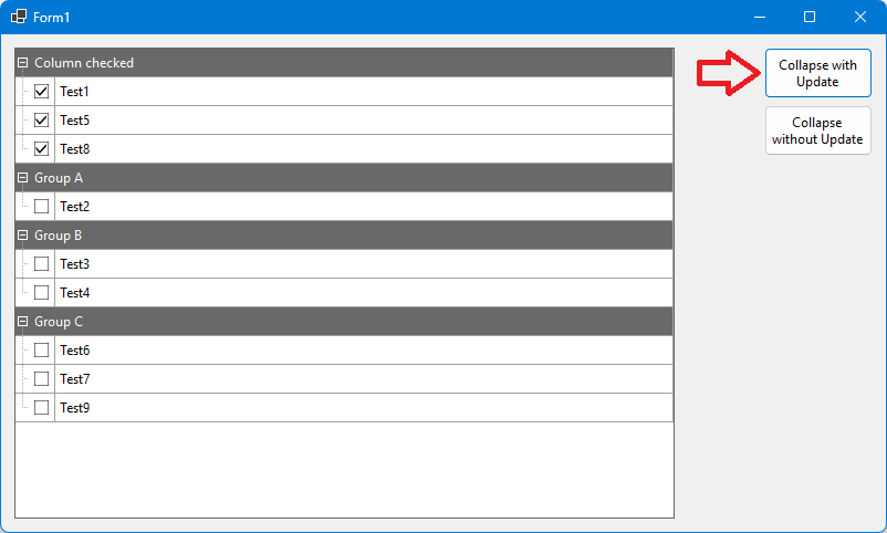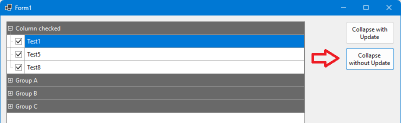 If you call “EndUpdate” after setting the expanded/collapsed state, all nodes will be expanded afterwards (this happens when clicking the button “Collapse with update”):