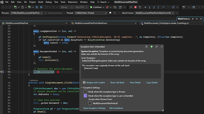 After I upgraded the C# WinForms project from .Net Framework 4.8.1 to .Net 8, then 9 and 10, an error started appearing when using C1MultiDocument. In my project, the error “IndexOutOfRangeException: Index was outside the bounds of the array” occurs. in this part of the code this.c1PrintPreviewControl1.Document = this.multiDoc;