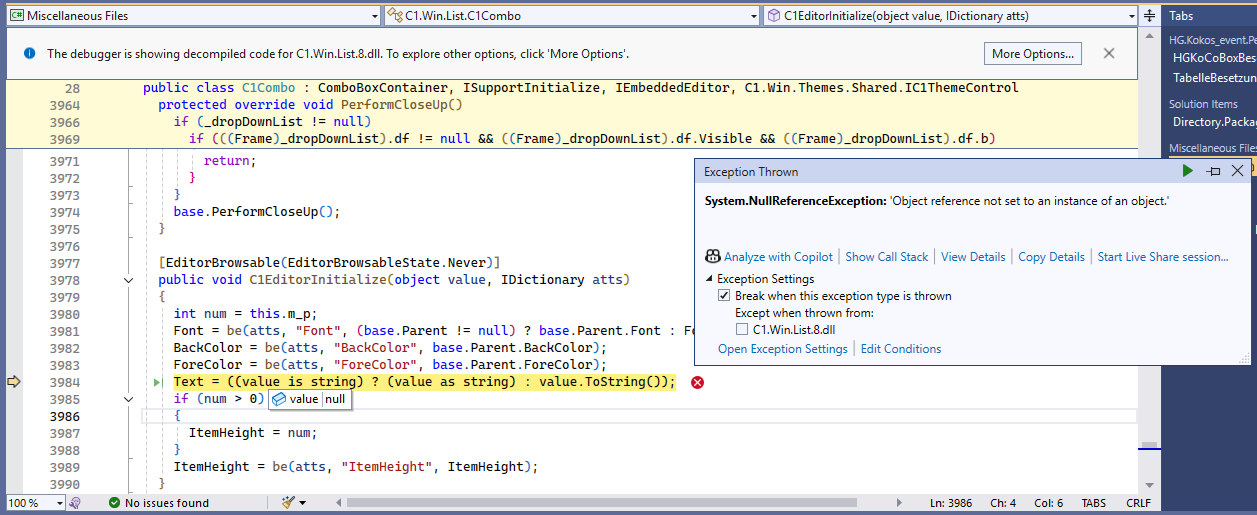 I think we are not affected by this issue, because our only C1Combo grid editor already implemented “IEmbeddedEditor” and used a real object instead of a string. I was just pointed to the problem because our combobox implementation now reported several warnings like “MyCustomCombo.SetFormat(string)’ hides inherited member ‘C1Combo.SetFormat(string)’. Use the new keyword if hiding was intended.”. After commenting our custom code, the exception came up because of null values in the cell.