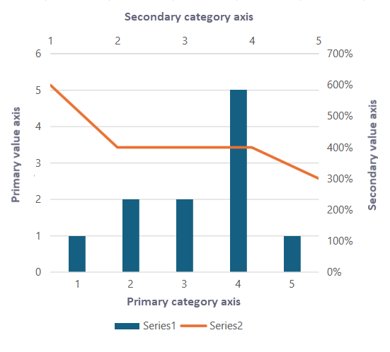 By default, a chart contains two primary axes - Primary Category Axis (X-axis) and Primary Value Axis (Y-axis). However, if a single set of primary axes is not sufficient to illustrate the data, such as when you are working with mixed data types, like combining a bar chart with a line chart, then secondary axes can be used. Secondary axes help you to efficiently represent datasets with different scales or units on the same chart.