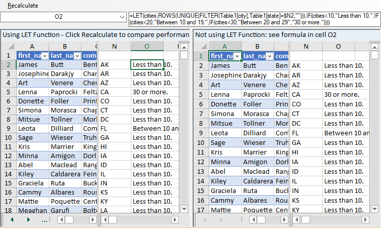 The left spreadsheet using the LET function calculates 2-4 times faster than the right spreadsheet which does not use LET function.