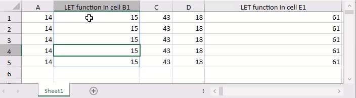 Similarly, cell E1 contains the formula "= LET (range, D1: D5, const, C1: C5, range + const)", which uses "range" and "const" as variables. Here, "range" stands for D1: D5 and "const" stands for C1: C5. This formula returns 61 as a result.